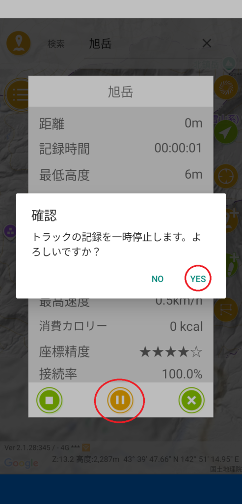 画面右側にあるトラックログボタン(足跡マーク)をタップすると、コントロールパネルが表示されます。下の中央にある一時停止ボタン→確認画面のYESをタップします。