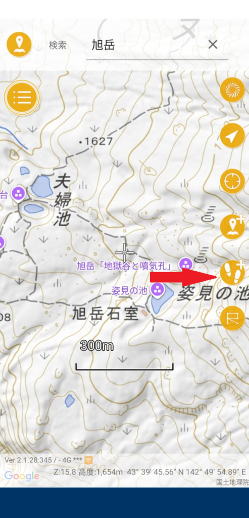 画面右側にあるトラックログボタン(足跡マーク)をタップします。コントロールパネルが表示されたら、左下の停止ボタンをタップします。