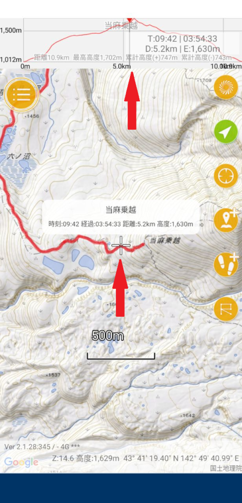 トラックログで標高と距離のグラフを見る事が出来ます。