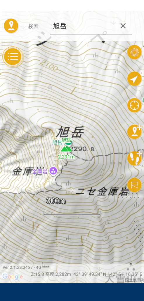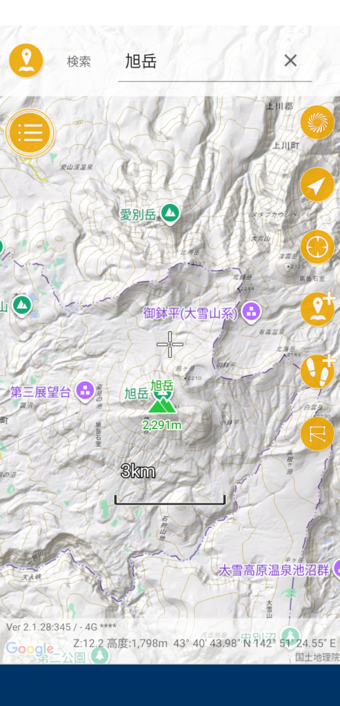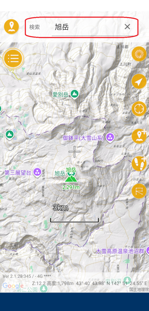 画面上部の座標バーをスライドさせると検索窓が出てきます。山の名前や山域を入力し、検索結果をタップ→確認画面でYESをタップします。