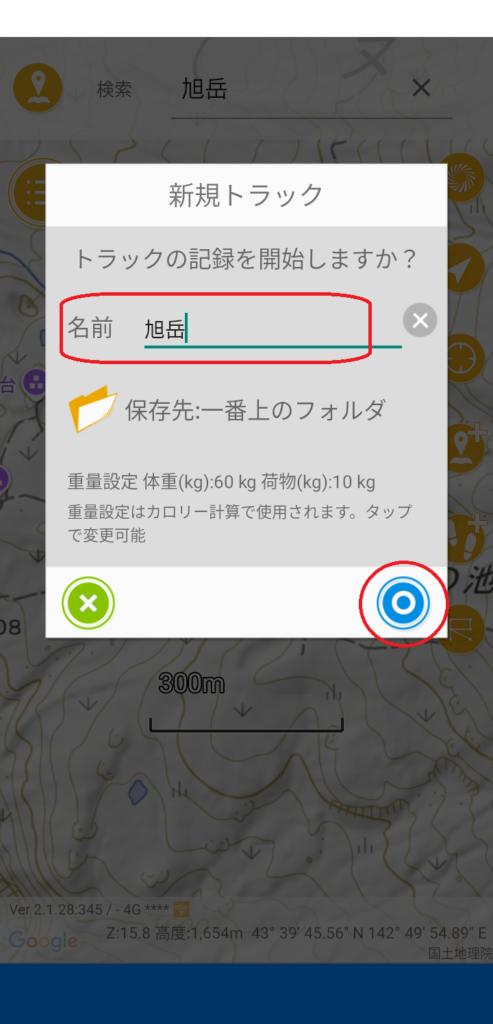 画面右側にあるトラックログボタン(足跡マーク)をタップします。トラックの開始画面がでるので、ログに付ける名前を入力して◎をタップします。